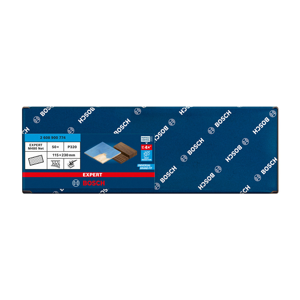 Fejlett porcsökkentés fa, festék és gipszkarton csiszolásakor - A Bosch Particle Control gondoskodik arról, hogy minden porszemcse a porszívóba vagy a szűrőbe kerüljön. A rendszer elsődleges eleme a Bosch EXPERT M480 csiszolóháló: A részecskék egyenesen áthaladnak a nyitott hálóstruktúráján, így nem tömítik el a felületet és nem szennyezik a levegőt. Ezáltal kiemelten hatékony és rendkívül tartós is. Csak ragaszd fel tépőzárral