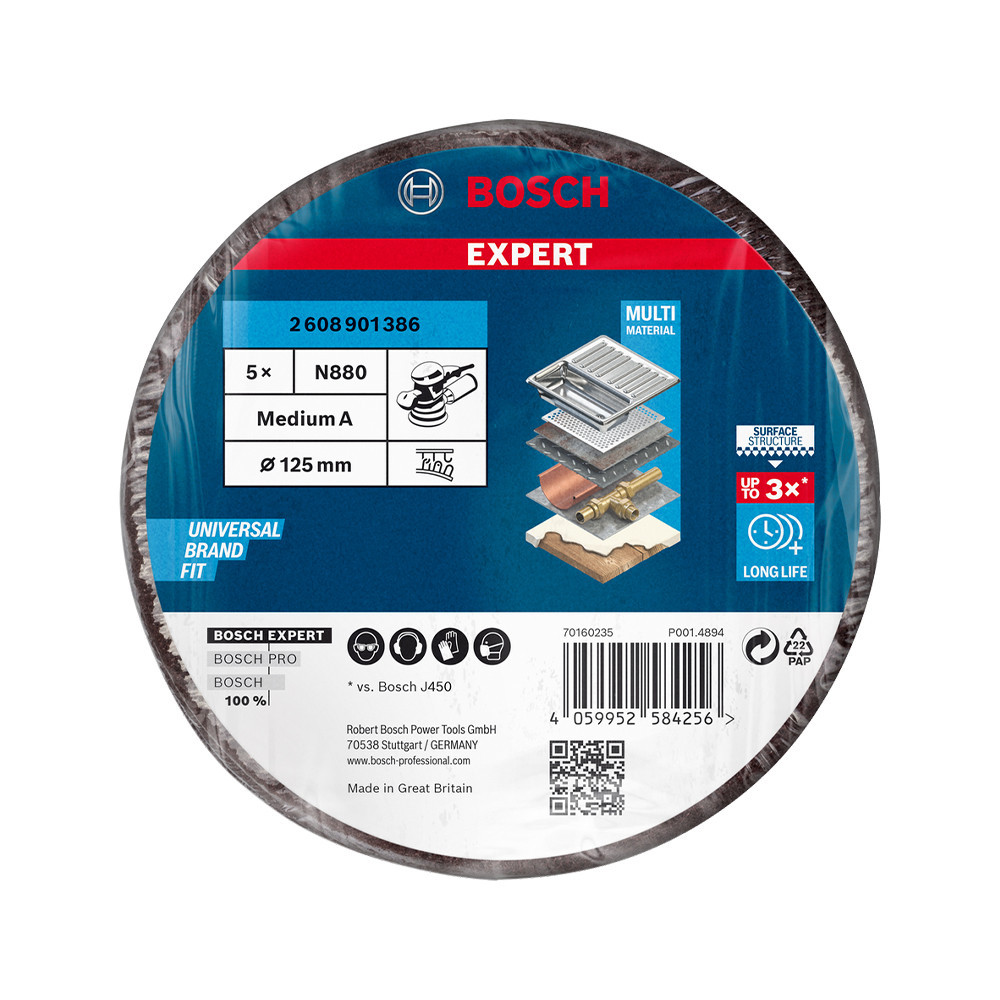 Akár 3x hosszabb élettartamot biztosít, mint a Bosch J475 normál bevonatú kézi csiszolólapok - A kiváló minőségű fémmegmunkáláshoz kiváló minőségű felületre, ehhez pedig jó, konzisztens csiszolóanyagra van szükség. Az EXPERT N880 nem csak az első használatba vételekor jó – hosszú időn át jó marad, egyenletes felületet biztosítva. Az EXPERT N880 filckorong jó példa a Bosch Surface Structure technológiájára: A legújabb csiszolási technológiát és gyártási szakértelmet ötvözi egyetlen, egyedülállóan tartós filckorongban. A háromdimenziós, keresztkötéses technológiával készült termék tartós teljesítményével pénzt takarít meg a mesterembereknek, és minimálisra csökkenti a csiszolólapok szemcsevesztése okozta frusztrációt. Legyen szó precíziós fémalkatrész simításáról, munkadarab tisztításáról vagy nehezen elérhető felületek eléréséről, az EXPERT N880 hosszú távon a legjobb választás. Csak ragaszd fel tépőzárral