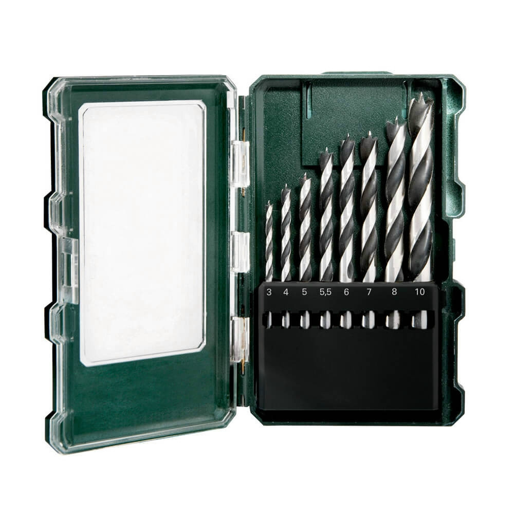 Csigafúró fához kiváló minőségű szerszámacélból, edzett, központosító csúccsalKemény- és puhafában, rétegelt falemezben, faforgácslapokban, stb. használható8 db-os, kiváló minőségű, robusztus műanyag dobozban, speciális Metabo dizájnnal, kihúzható Euroloch akasztóvalÁtmérő: 3 / 4 / 5 / 5,5 / 6 / 7 / 8 / 10 mm