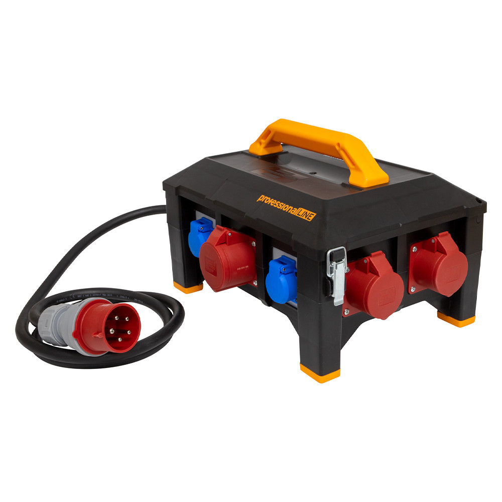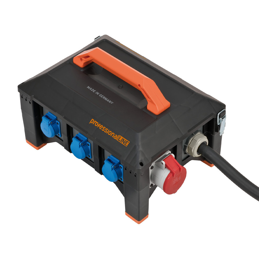 Gumiból készült áramelosztó praktikus fogantyúval a kényelmes szállításhoz, rögzítő hevederrel a kábelrögzítéshez, valamint rendkívül magas és csúszásmentes gumilábakkal a padlóval kapcsolatos szennyeződések ellen