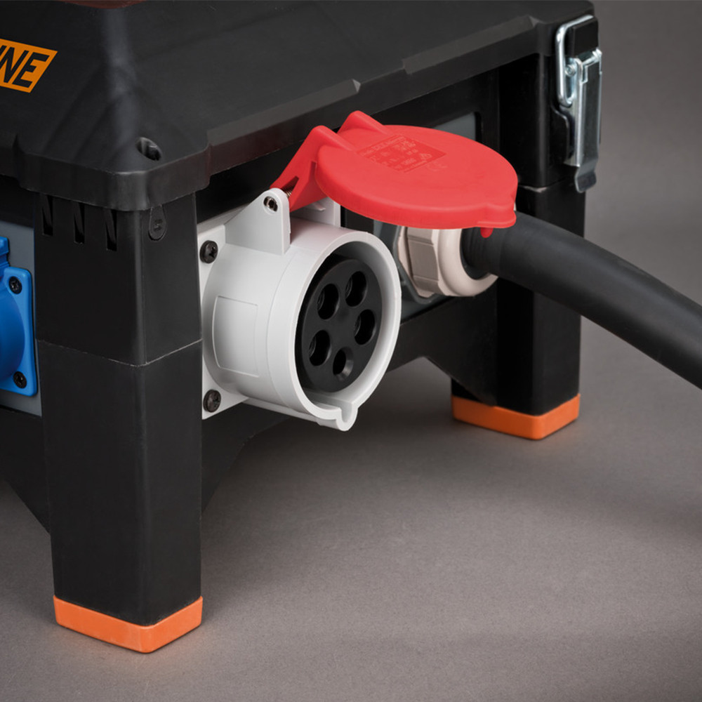 Gumiból készült áramelosztó praktikus fogantyúval a kényelmes szállításhoz, rögzítő hevederrel a kábelrögzítéshez, valamint rendkívül magas és csúszásmentes gumilábakkal a padlóval kapcsolatos szennyeződések ellen