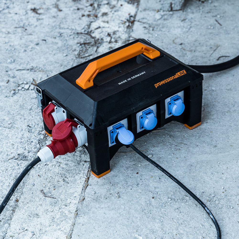 Rendkívül robusztus áramelosztó a VDE 0620-2-1 szabvány szerinti minőségi aljzatokkal és nikkelezett érintkezőkkel ellátott CEE aljzatokkal - strapabíró kültéri használatra készült