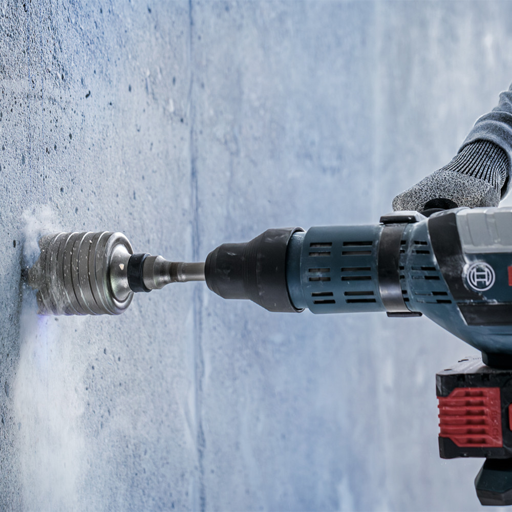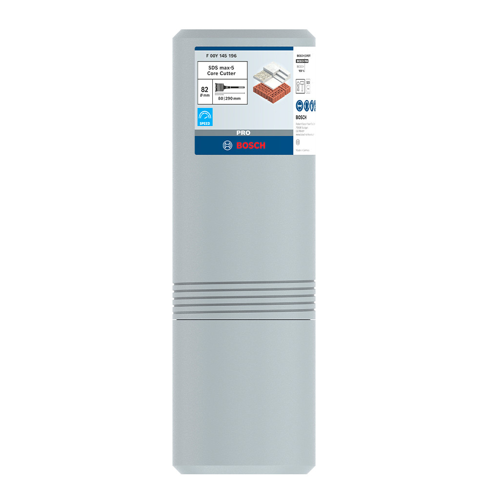 A PRO SDS max-5 Core Cutter erős keményfém fogakat használ a kivételes előrehaladás és tartósság érdekében. A fogak aszimmetrikusak és alkalmazkodnak a fúrókorona átmérőjéhez, így könnyebben vághatsz vele ki mély, pontos lyukakat a kapcsolószekrények és csövek számára. A fúrókorona két forgácshornya hatékonyan távolítja el a port. Ez egy egyrészes tartozék, ami azt jelenti, hogy a géptől a fúrókoronáig maximális az erőátvitel. Az alábbi anyag(ok)hoz ajánlott: beton, beton falazóblokk, mész és homoktégla, tömör tégla