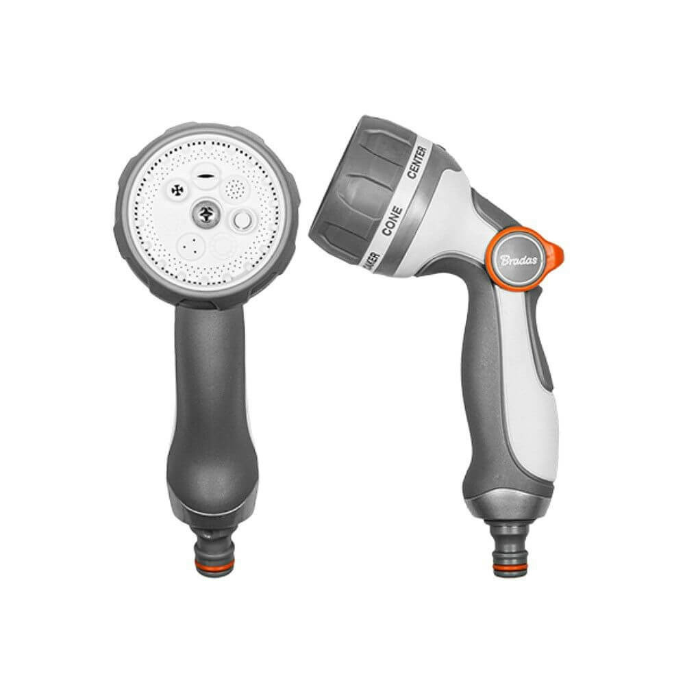 ABradas White LineWL-EN53M 7 funkciós locsolópisztoly lehetővé teszi, hogy különböző vízsugár formával öntözzön, akár az erős vízáramtól az enyhe ködig