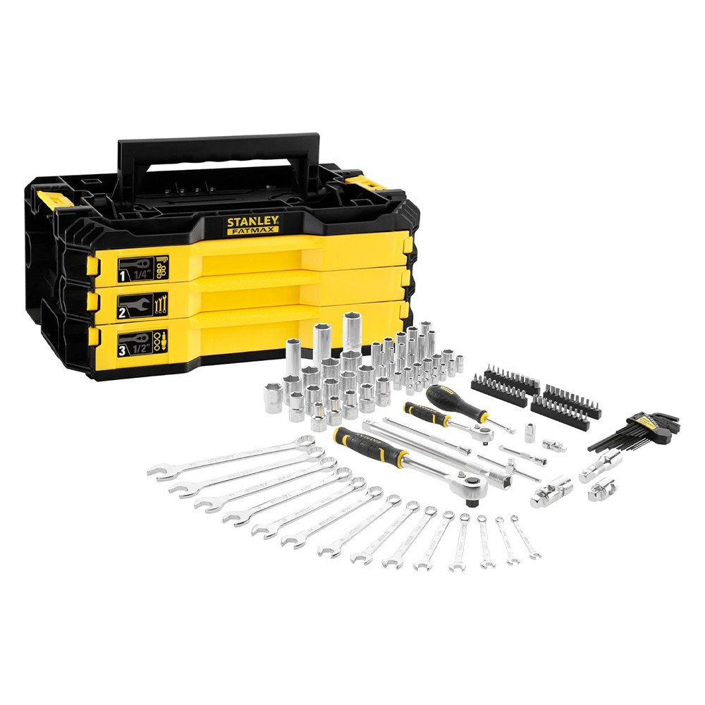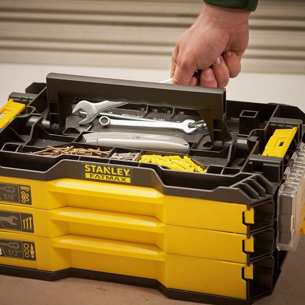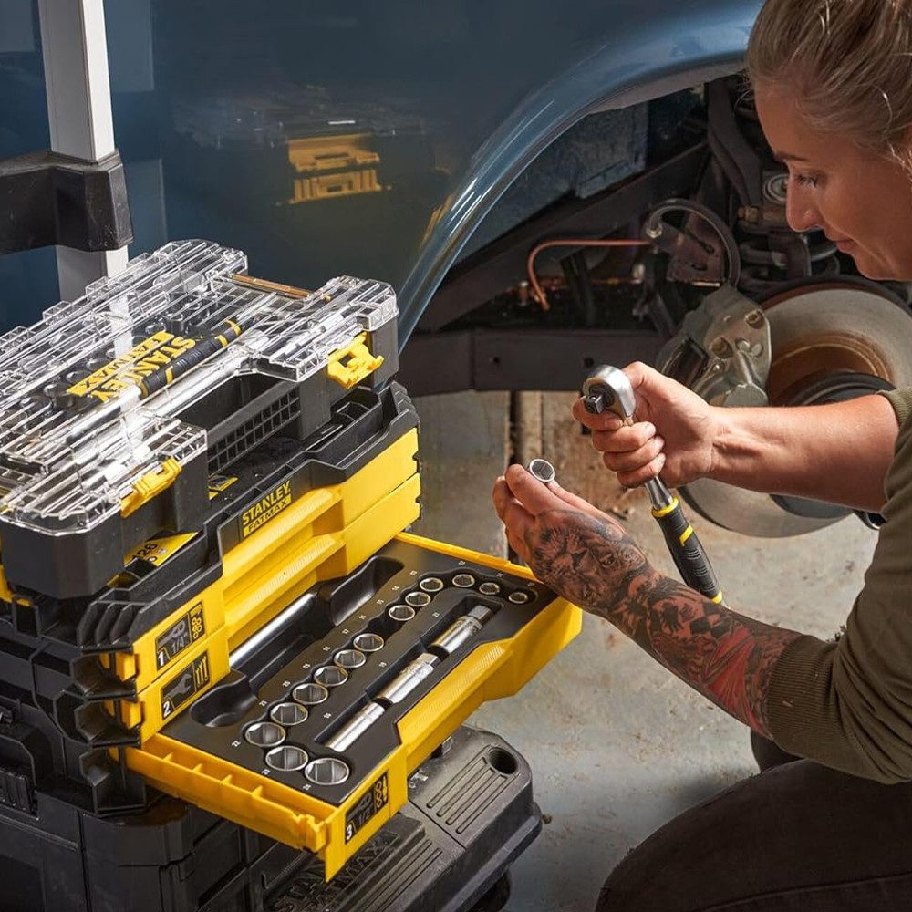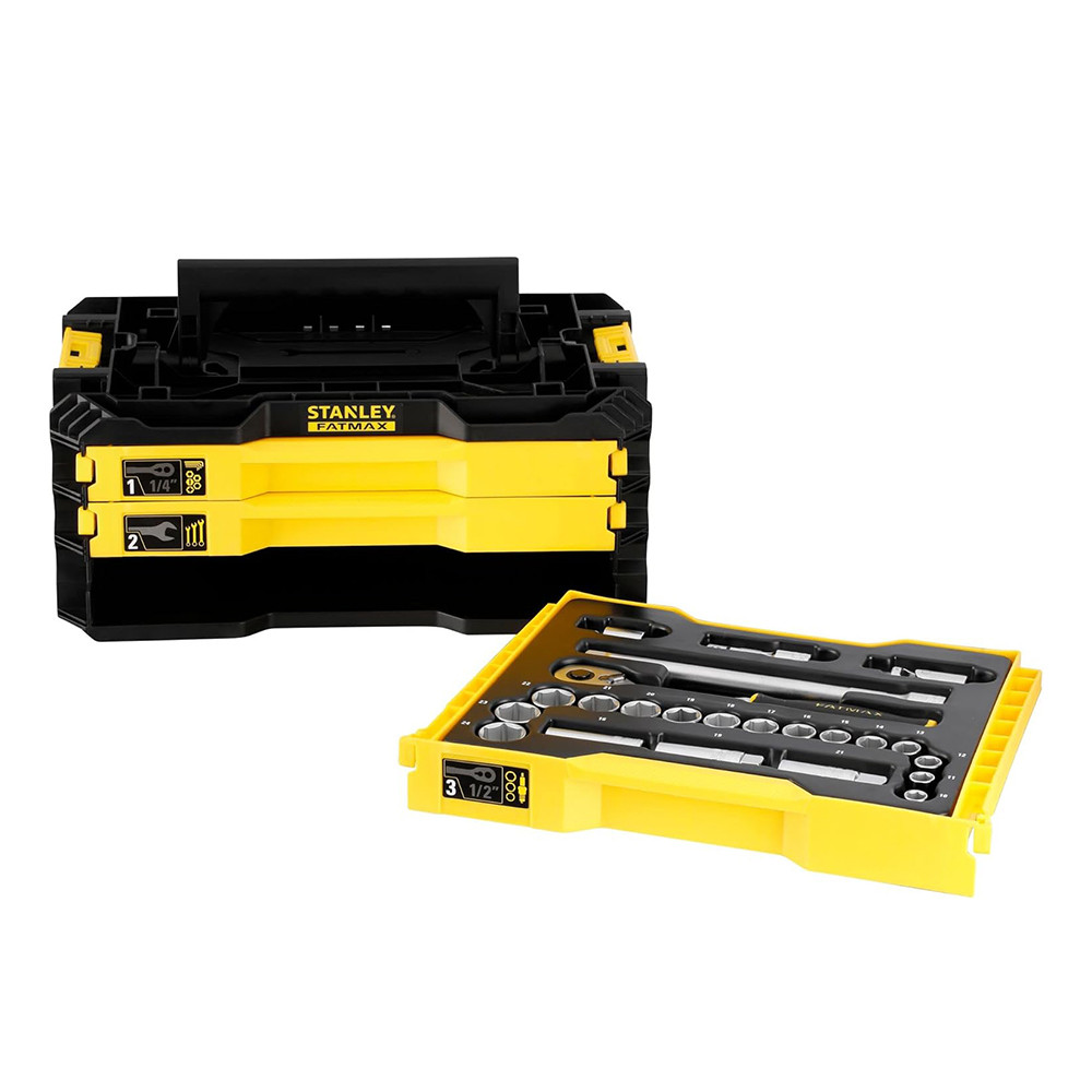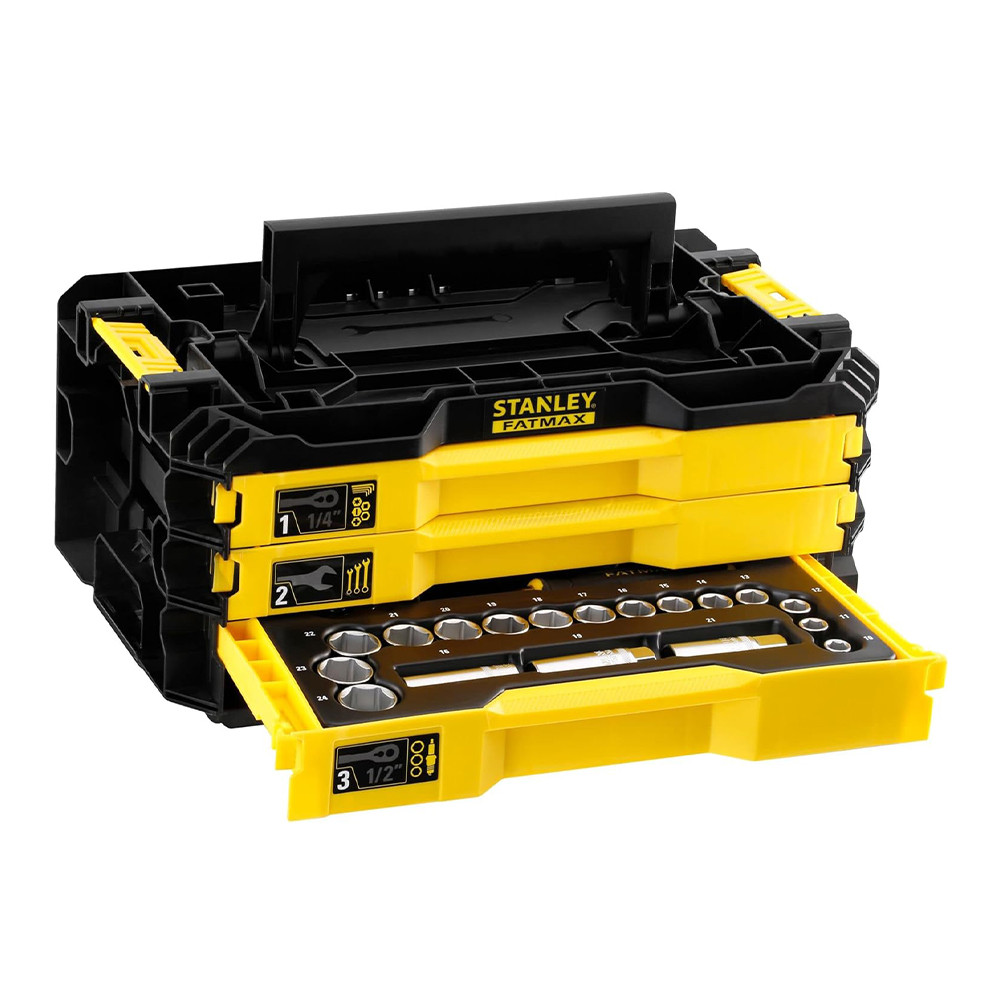 A STANLEY® FATMAX® 3 fiókos készlet – 1/4" és 1/2" - 126 darabos, teljesen csatlakoztatható és kompatibilis a STANLEY® FATMAX® PRO-STACK tárolórendszerrel