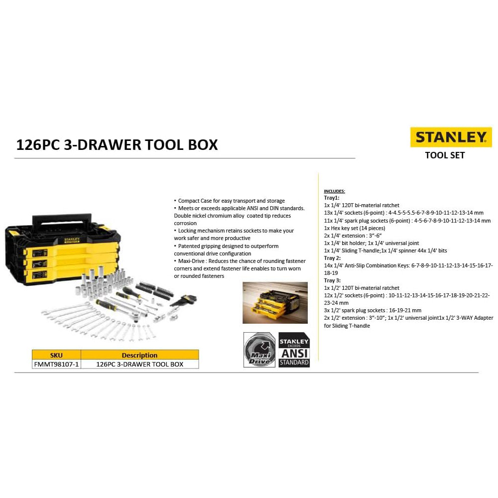 Stanley 3 fiókos szett tárolódobozban 126 részes