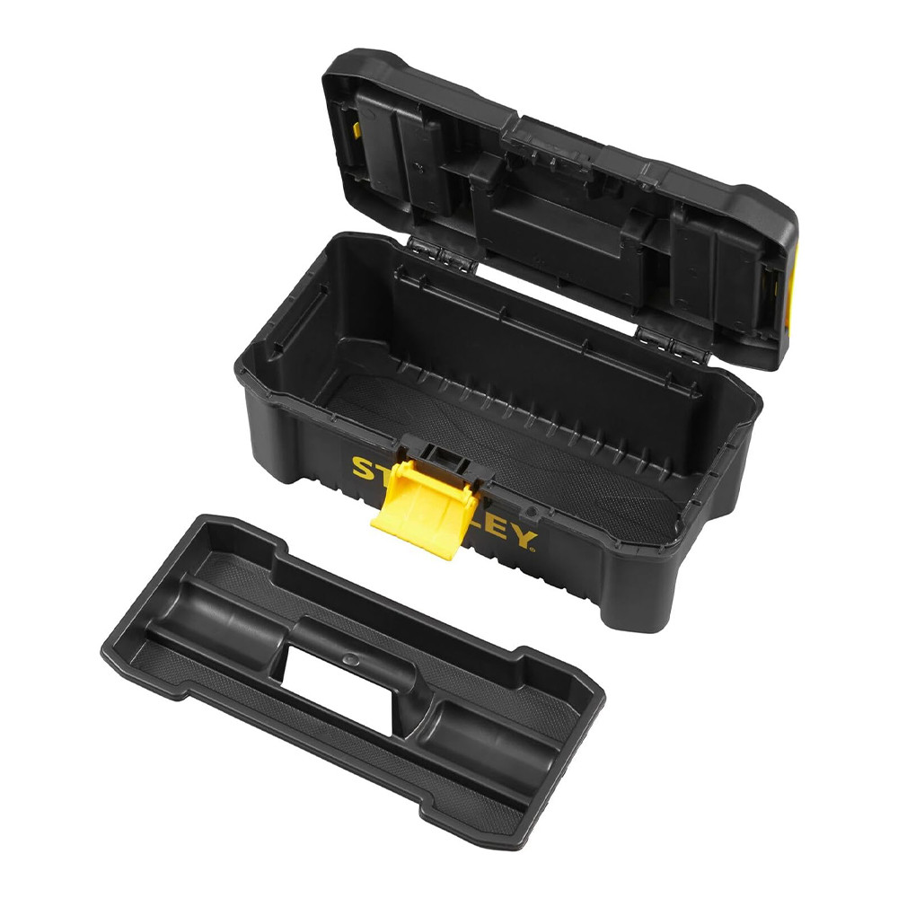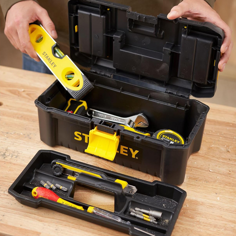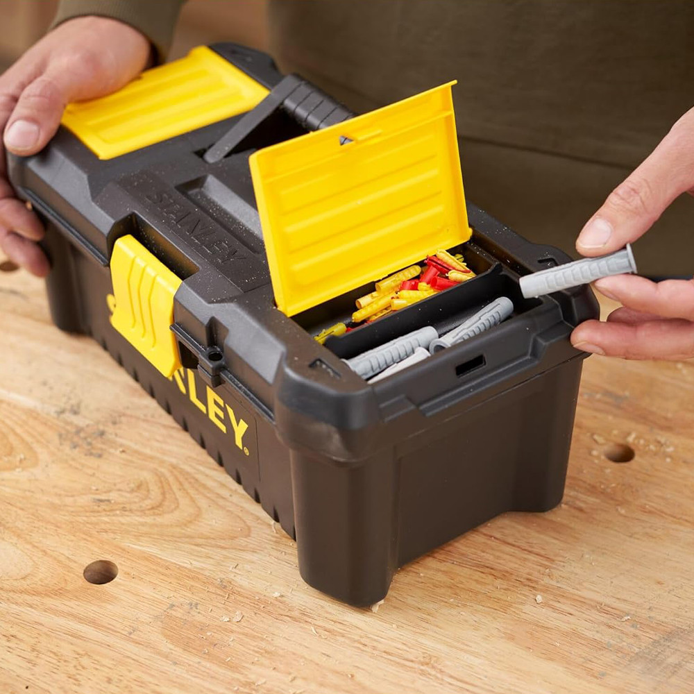 A STANLEY® 12,5 hüvelykes műanyag zárral ellátott szerszámosláda ideális a mindennapi szerszámok tárolására