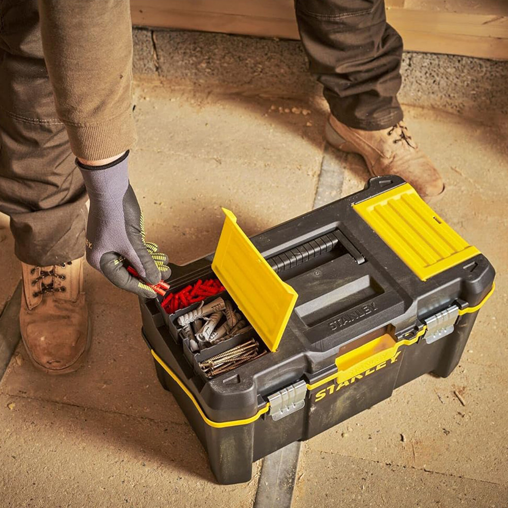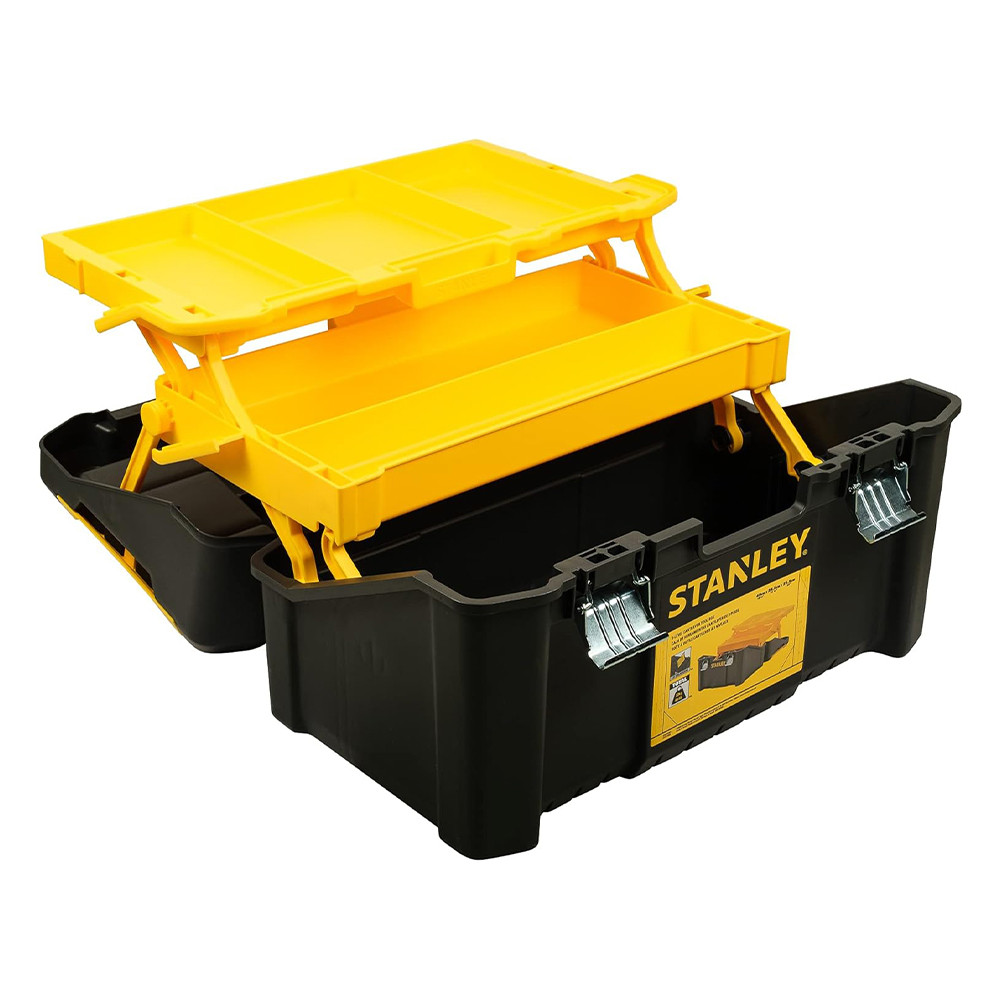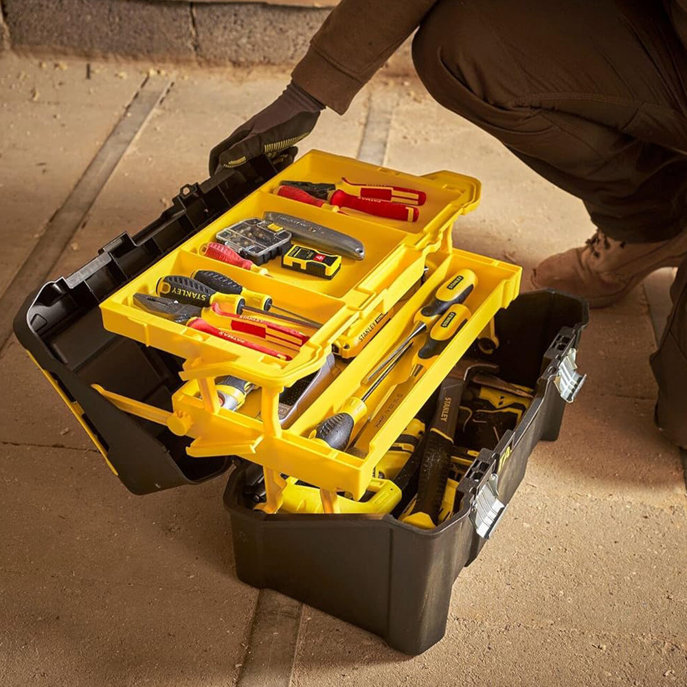 A STANLEY® 3-szintes konzolos szerszámosláda, amely 3 tárolószinttel rendelkezik a szerszámok és tartozékok gyors eléréséhez