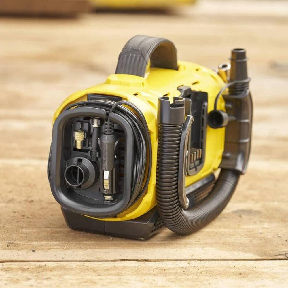 A pumpa három áramforrást kínál: V20 akkumulátort (külön megvásárolható), fali csatlakozót vagy 12 V-os autós adaptert a maximális kényelem és sokoldalú felhasználás érdekében