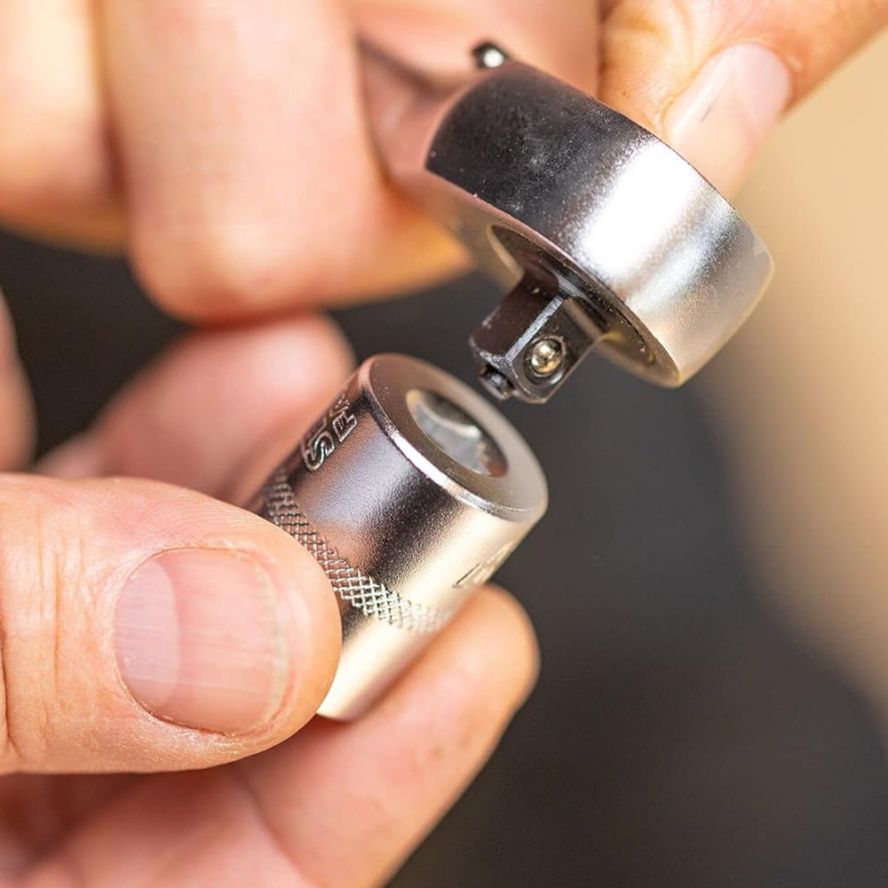 Nagy, síkban elhelyezett gyorskioldó gombbal rendelkezik a dugókulcsok egyszerű eltávolításához