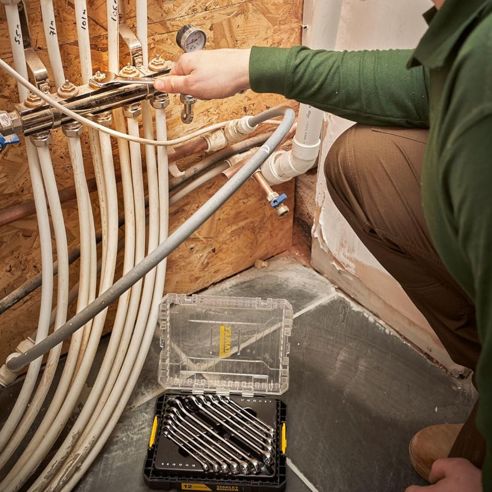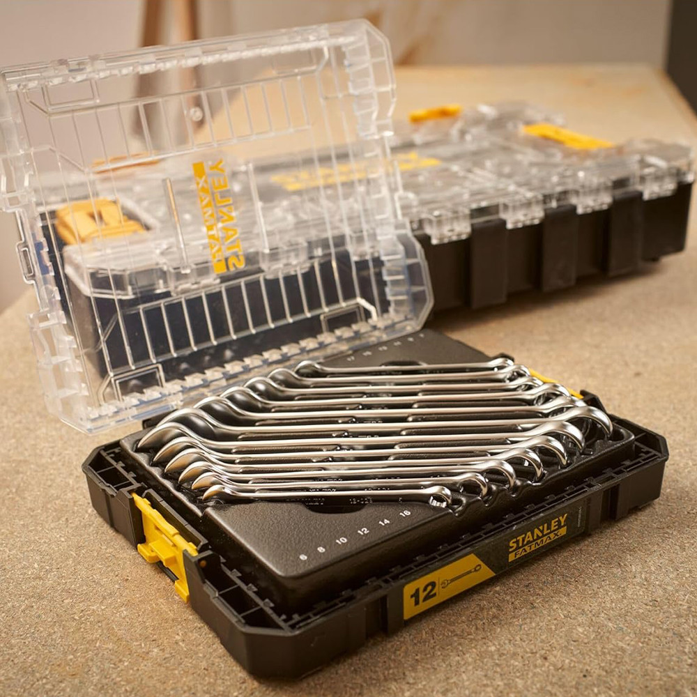 A STANLEY® FATMAX® M PRO-STACK kombinált villáskulcs készlet, 12 részes, teljesen csatlakoztatható és kompatibilis a STANLEY® FATMAX® PRO-STACK tárolórendszerrel