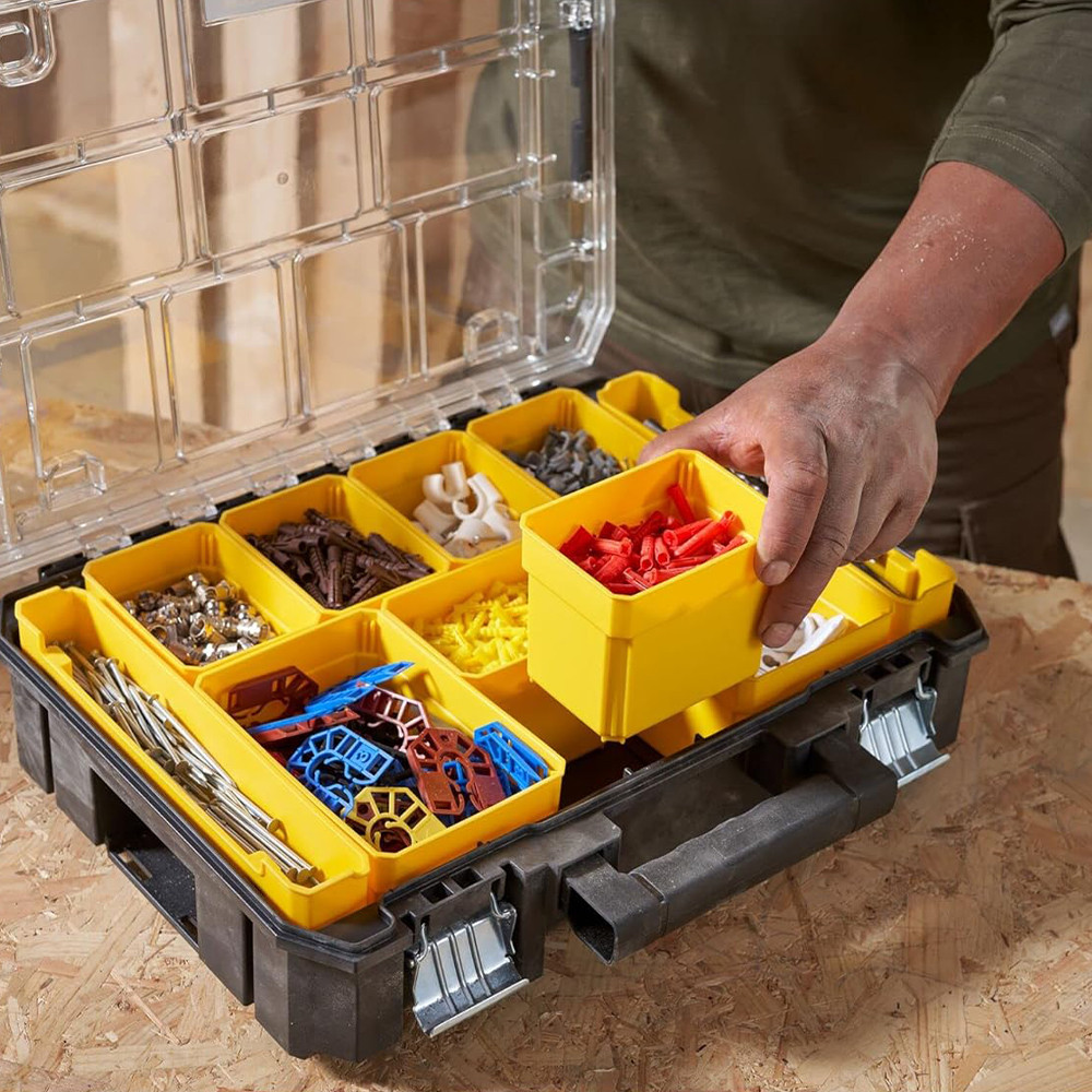 Változatos kombináció: nagy, dupla és hosszú rekeszek kisalkatrészek, tartozékok és hosszú szerszámok részére