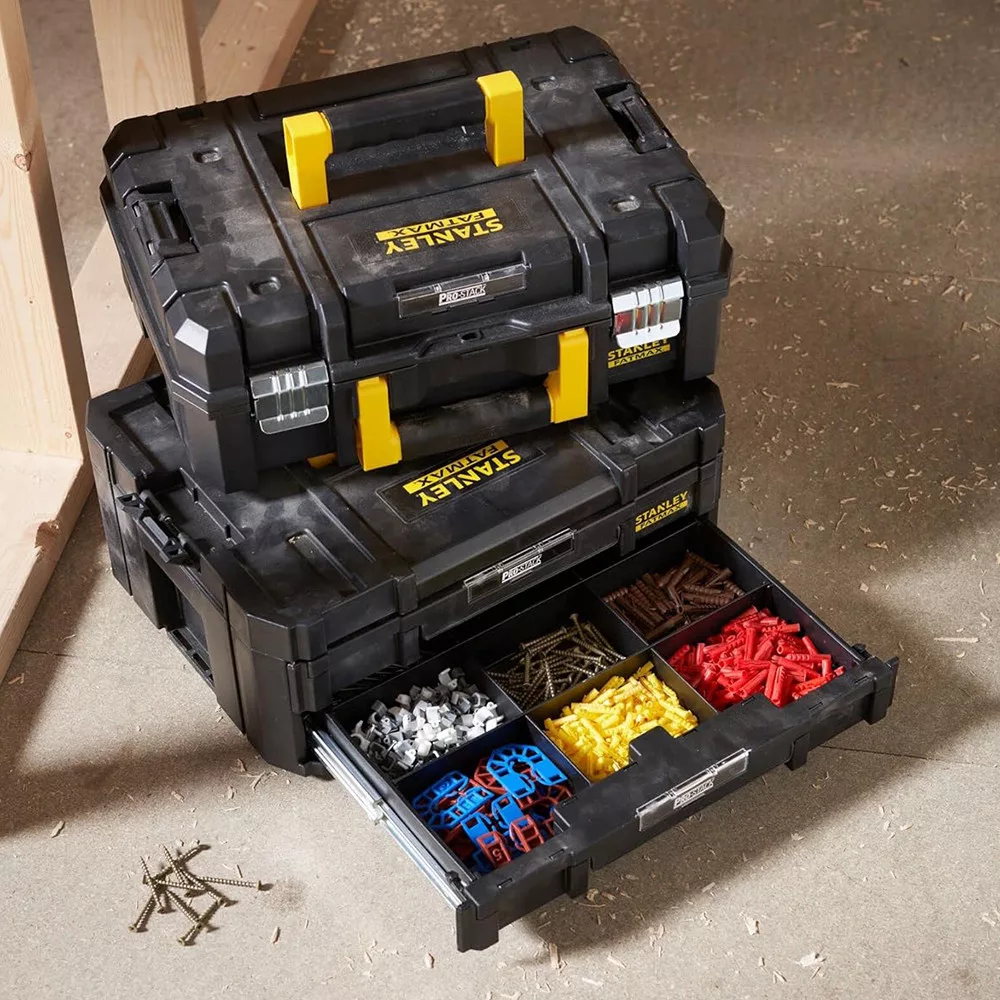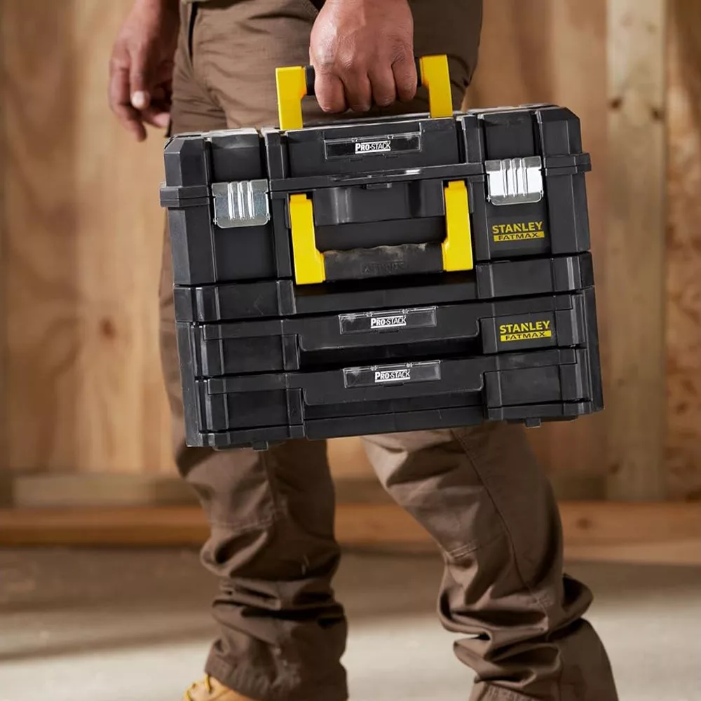 Tartalmazza a STANLEY® FATMAX® PRO-STACK™ keskeny dobozt és a STANLEY® FATMAX® PRO-STACK™ 2 fiókos tárolót, amelyek összesen 21,6 literes űrtartalmat tesznek lehetővé