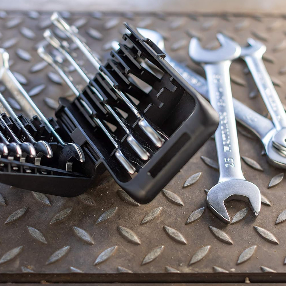 A korrózióálló króm-vanádium acélból kovácsolt, szatén króm bevonattal és csúszásgátló profillal ellátott STANLEY® FATMAX® 7 darabos villáskulcskészlet egy helytakarékos, összecsukható fogantyúval ellátott, tartós tárolóban tárolható és rendszerezett, így a villáskulcsok rendben és rendszerezetten tárolhatók