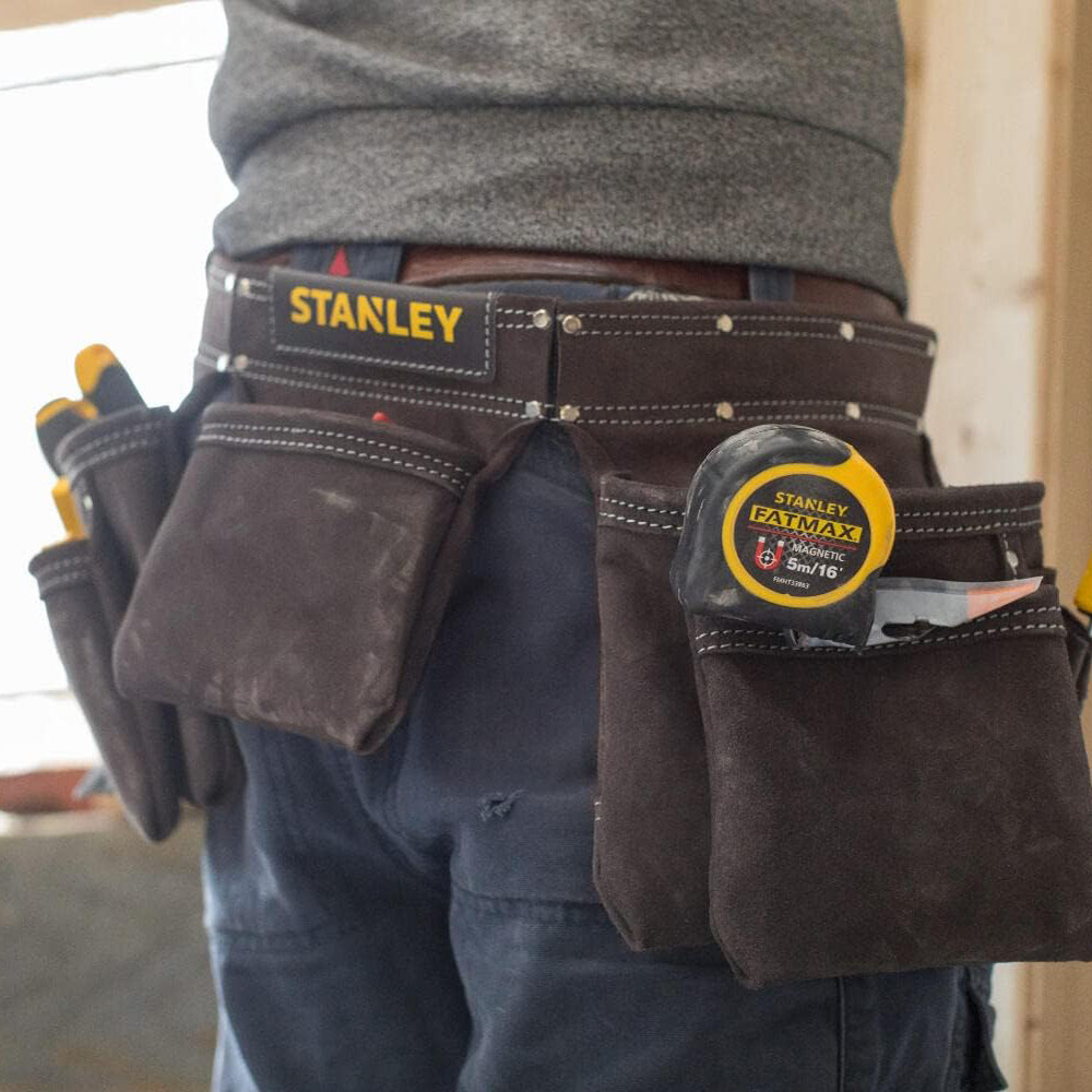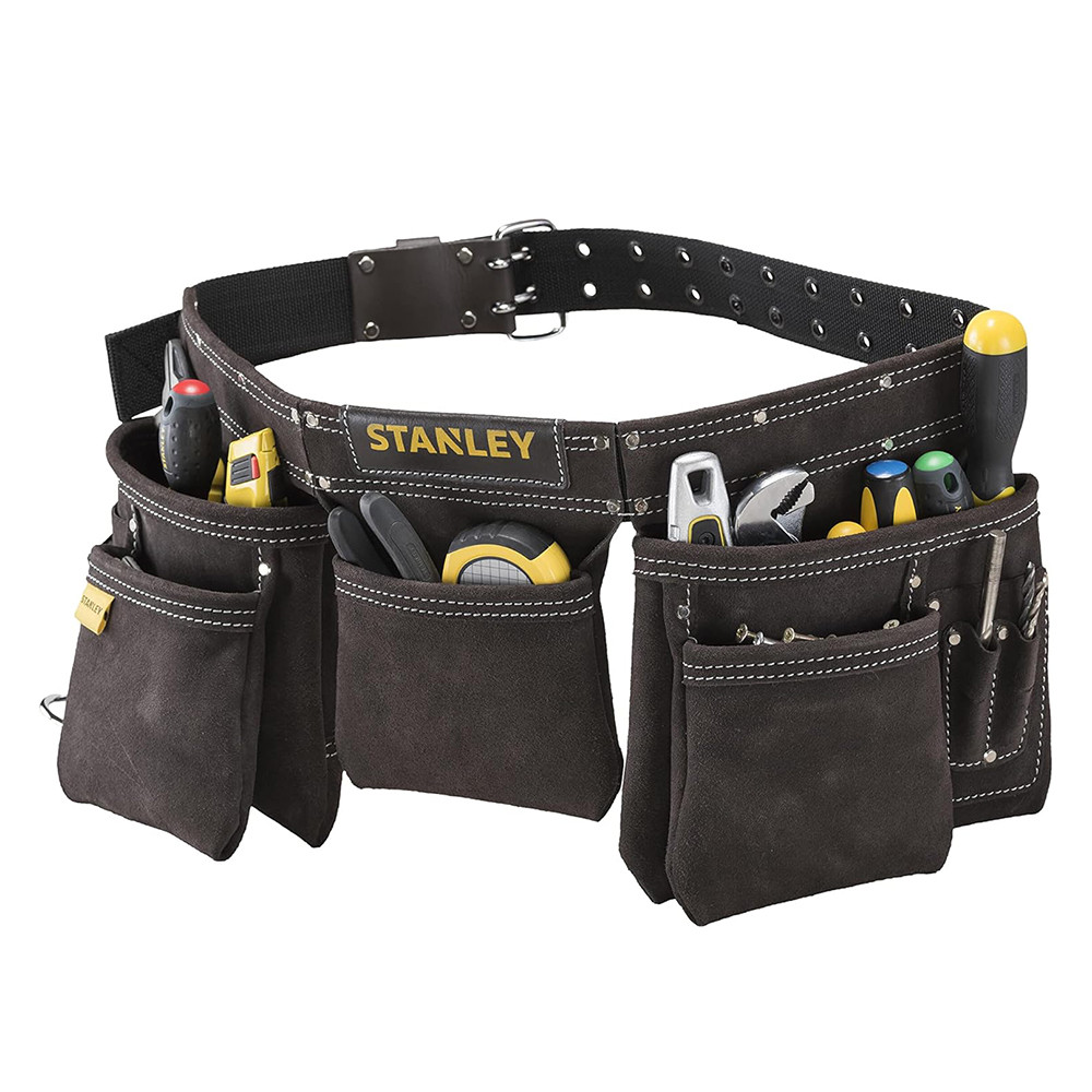 A STANLEY® bőr szerszám övtáska zsebekkel és tartókkal rendelkezik a szerszámok kényelmes eléréséhez, valamint egy beépített kalapácshurokkal, amely acélból készült a kalapácsok biztonságos tárolására. A kötény állítható övvel és csattal rendelkezik az optimális kényelem és biztonság érdekében. Kiváló minőségű velúr bőrből készült a tartósság érdekében, és a STANLEY® bőr szerszámöv-kínálatának része.