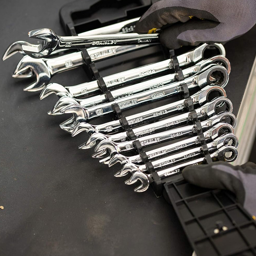 A korrózióálló króm-vanádium acélból kovácsolt, magas króm bevonatú STANLEY® 12 darabos racsnis villáskulcskészlet egy helytakarékos, összecsukható fogantyúval ellátott, tartós állványban tárolható és rendszerezett, így a villáskulcsok rendben és rendszerezetten tarthatók