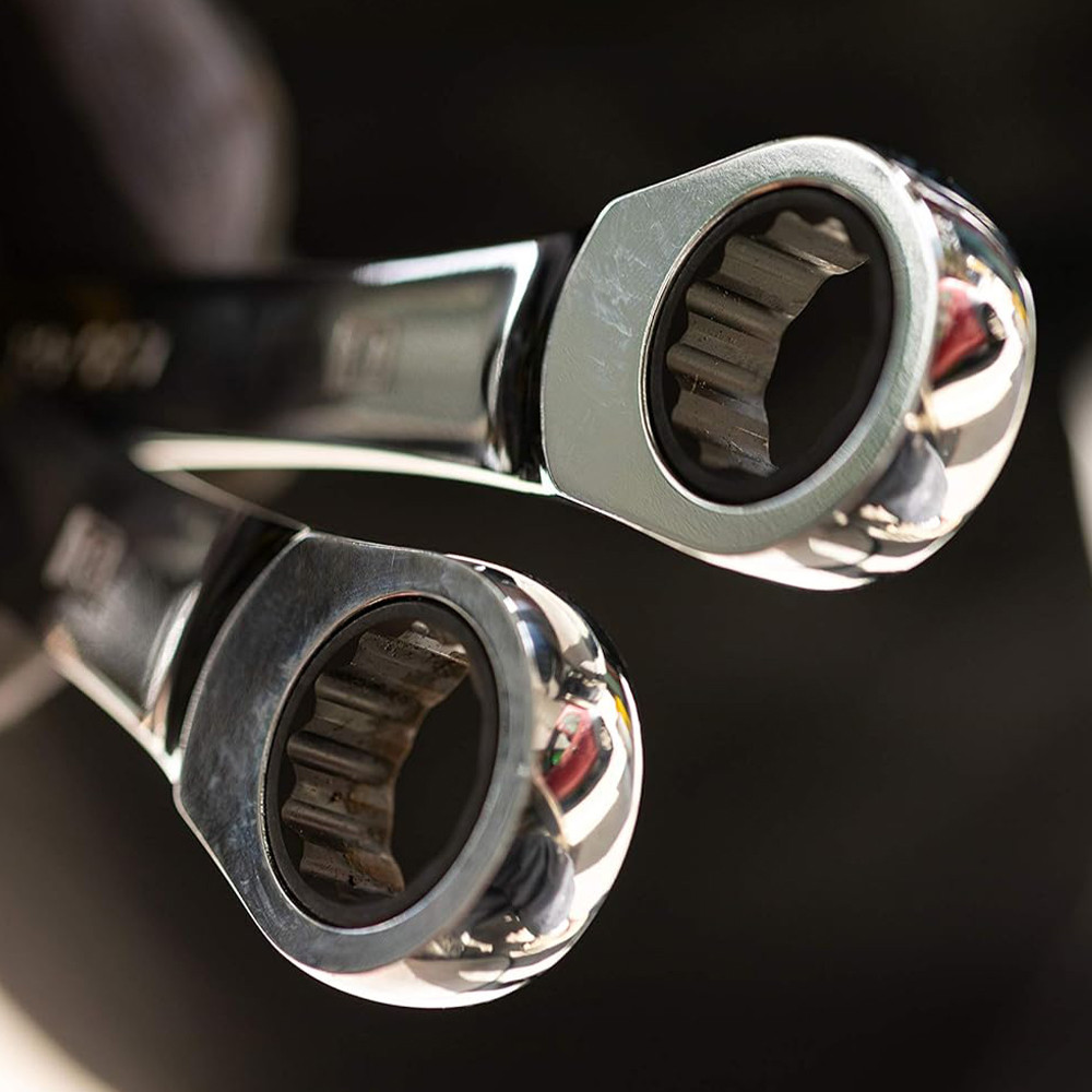 A 12 pontos, sokoldalú, négyszögletes végű, nyitott és négyszögletes végű villáskulcs 15°-os eltolással a nyitott végén és 0°-os eltolással a négyszögletes végén megduplázza a hozzáférési szöget, és helyet teremt a kezek vagy az akadályok számára szűk munkaterületeken