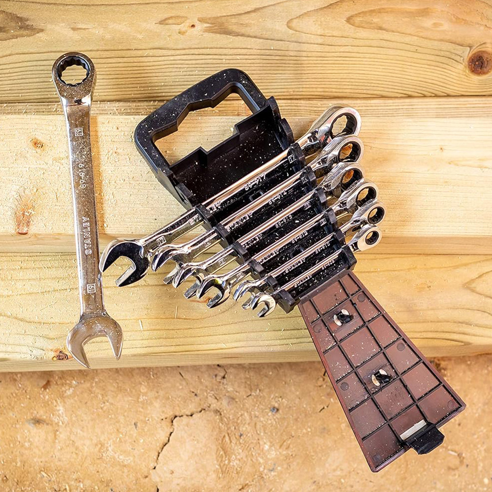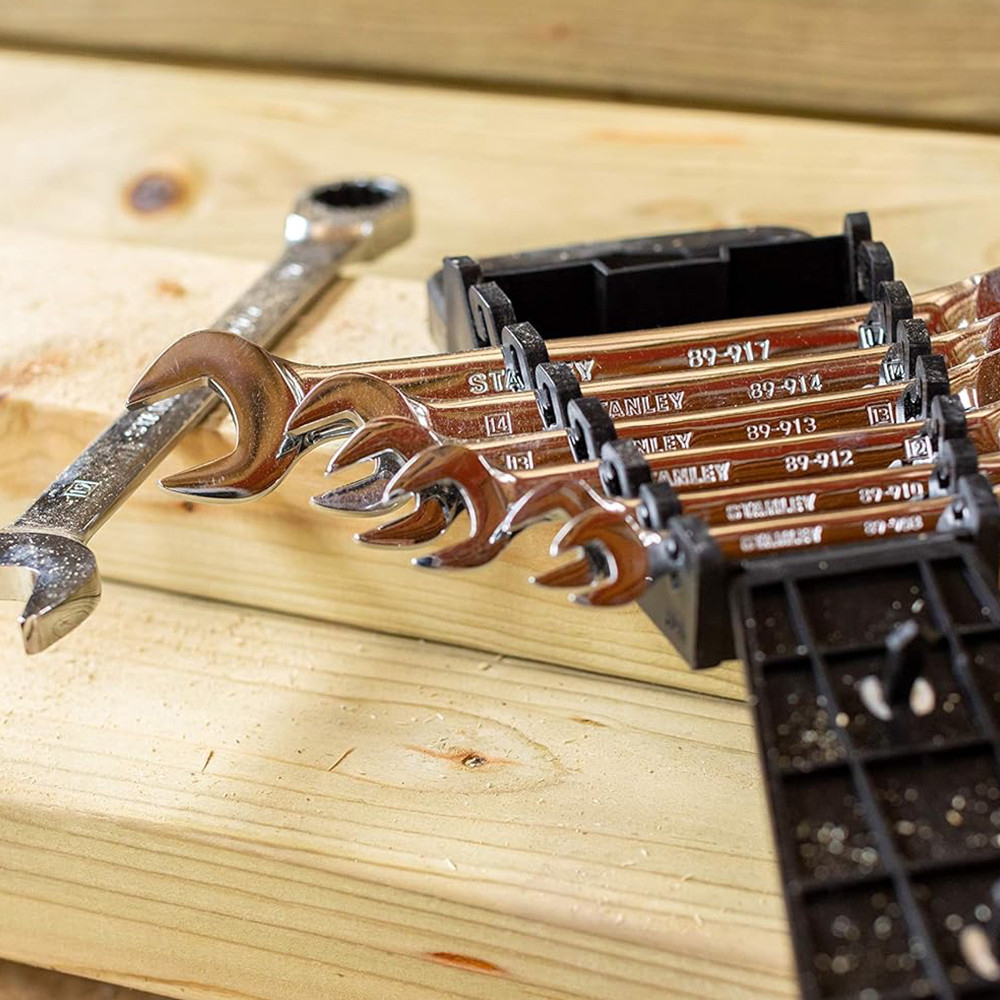 A korrózióálló króm-vanádium acélból kovácsolt, magas króm bevonatú STANLEY® 7 darabos racsnis villáskulcskészlet egy helytakarékos, összecsukható fogantyúval ellátott, tartós állványban tárolható és rendszerezett, így a villáskulcsok rendben és rendszerezetten tarthatók