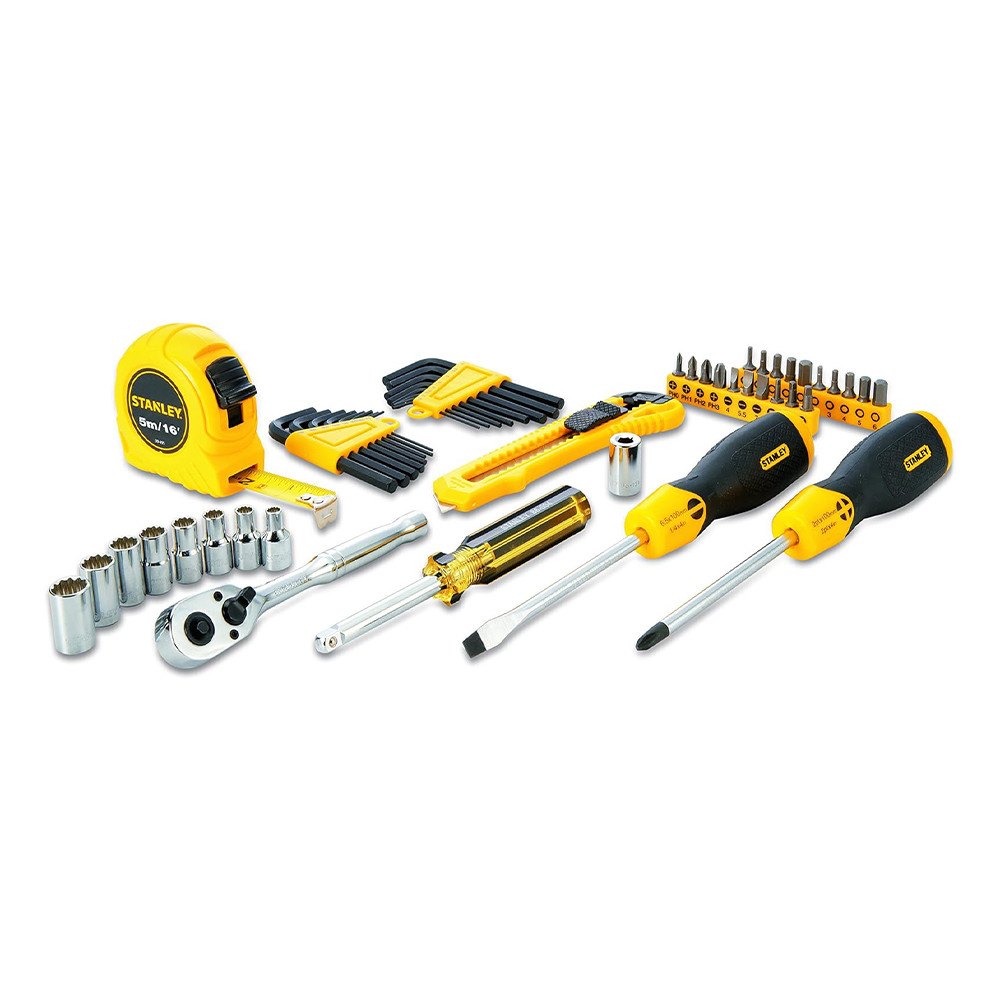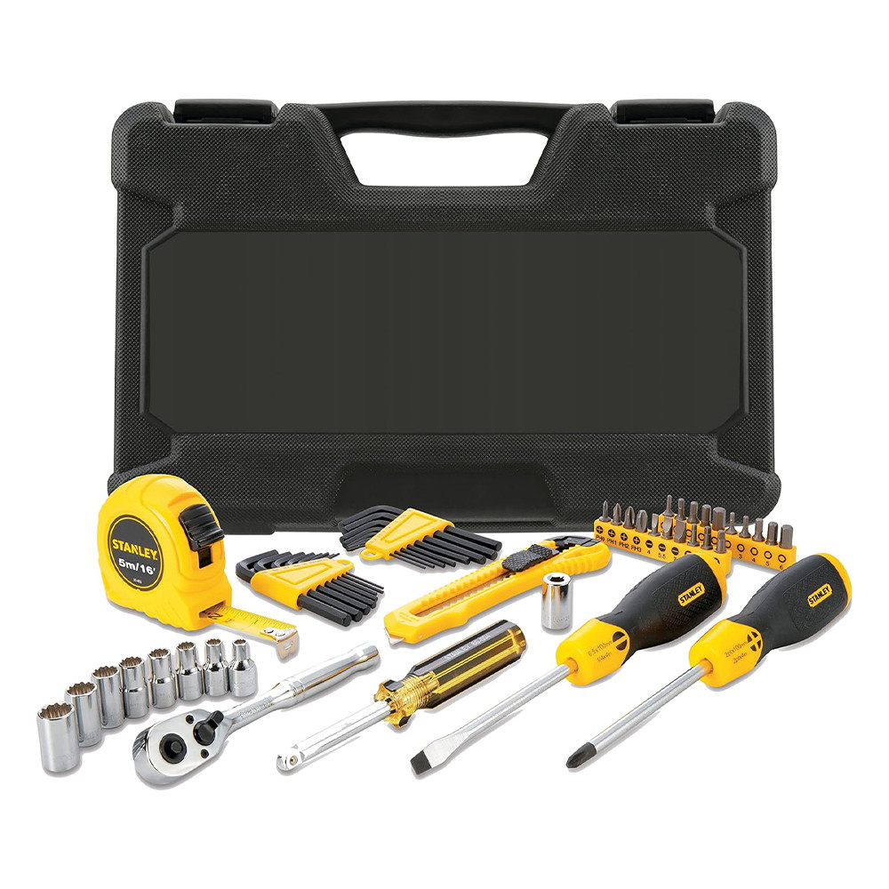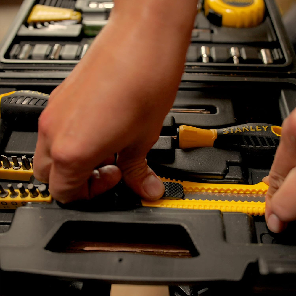 A STANLEY® Vegyes szerszámkészlet 51 darabos kofferrel ideális otthoni és munkahelyi feladatok elvégzéséhez, legyen szó mérésről, vágásról, racsnis meghajtásról vagy csavarozásról